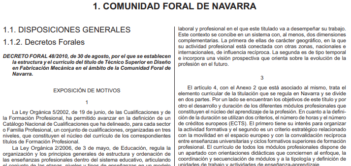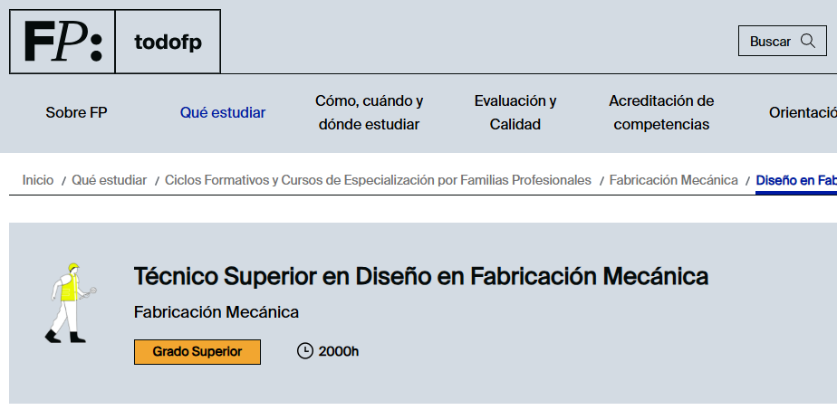 Grado SuperiorEl objetivo del Ciclo Formativo de Grado Superior de Diseño en Fabricación Mecánica en Navarra es formar técnicos superiores capacitados para concebir, desarrollar y documentar productos industriales dentro del ámbito de la fabricación mecánica, integrando criterios técnicos, normativos y de calidad, y respondiendo a las demandas reales del sector productivo. Esta titulación prepara al alumnado para idear soluciones constructivas de productos mecánicos, diseñar útiles de procesado de chapa, moldes y modelos destinados a procesos como fundición, forja, estampación o pulvimetalurgia, y elaborar la documentación técnica necesaria para su fabricación, siempre bajo el cumplimiento de la normativa de prevención de riesgos laborales y protección ambiental.