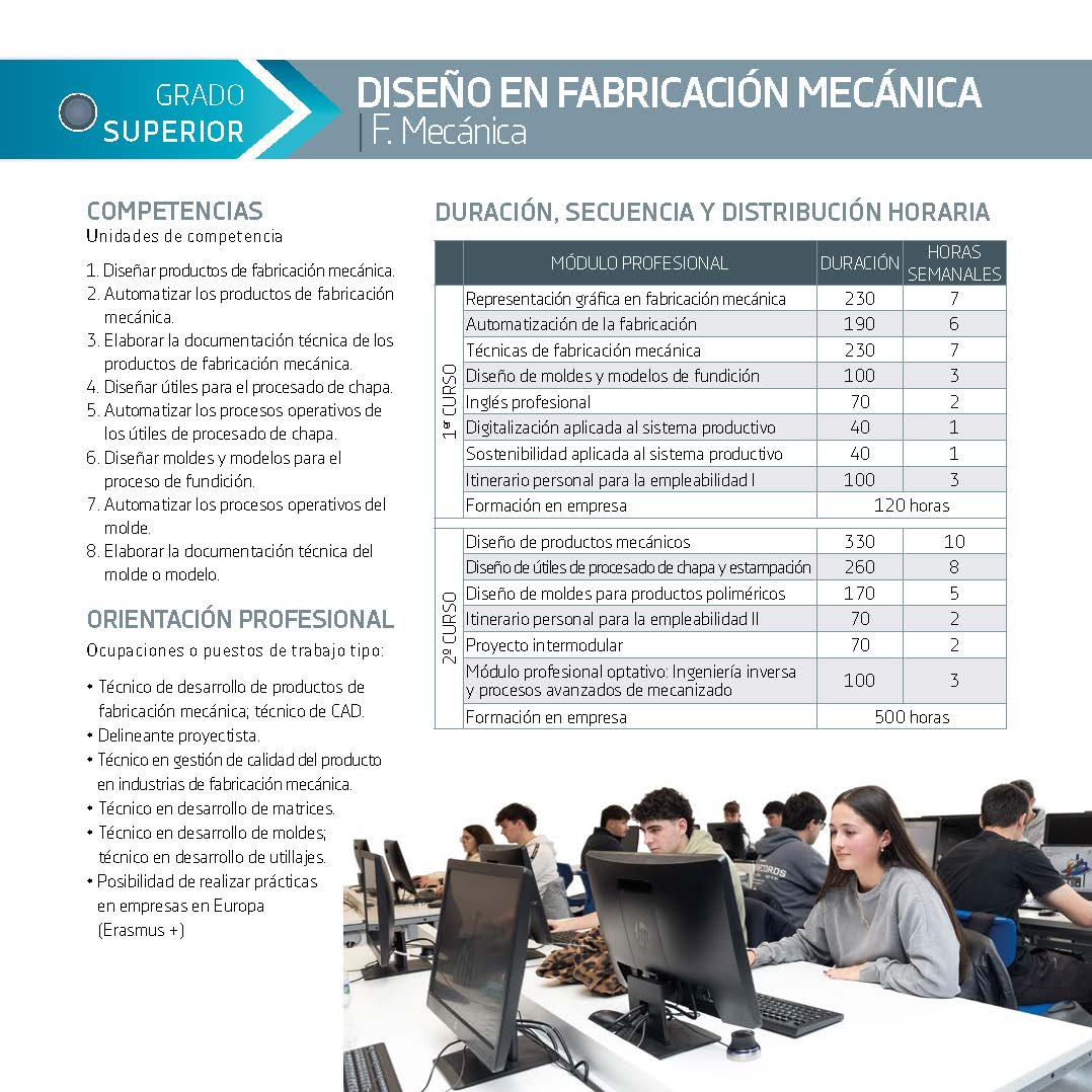 El ciclo, con una duración aproximada de 2.000 horas repartidas entre formación en el centro educativo y prácticas en empresas, combina materias de diseño asistido por ordenador (CAD), cálculo de elementos mecánicos, técnicas de fabricación, representación gráfica y automatización de procesos, con una formación aplicada y orientada a la realidad industrial.