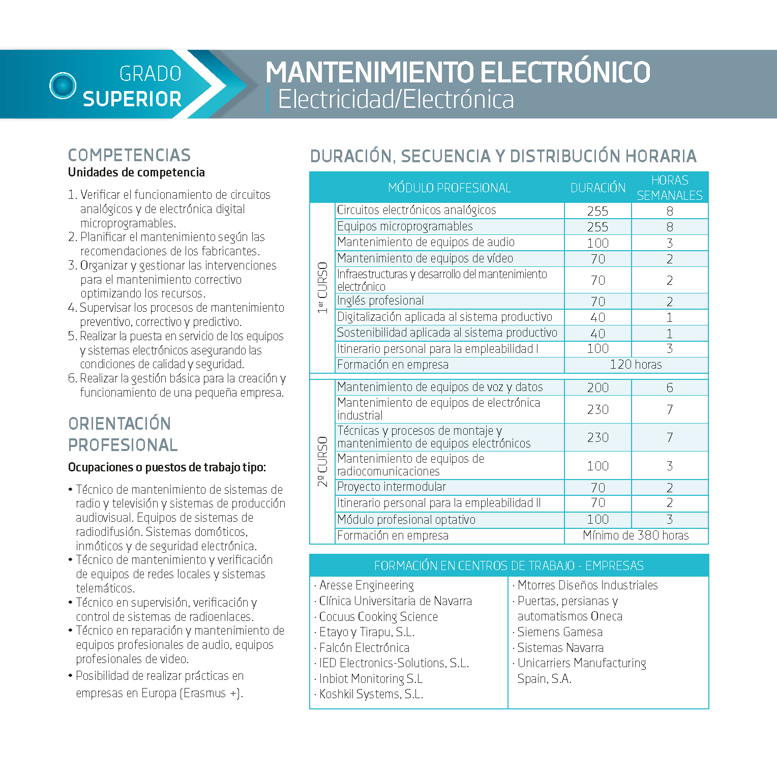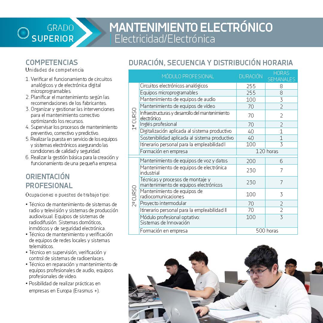 Estos estudios combinan teoría y práctica y preparan al alumnado para mantener, supervisar, verificar y reparar sistemas electrónicos complejos, como equipos de radiocomunicaciones, redes locales y telemáticas, sistemas de seguridad y domótica, equipos audiovisuales profesionales y otros sistemas electrónicos integrados.