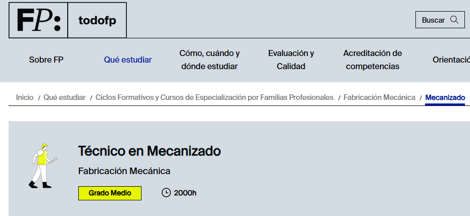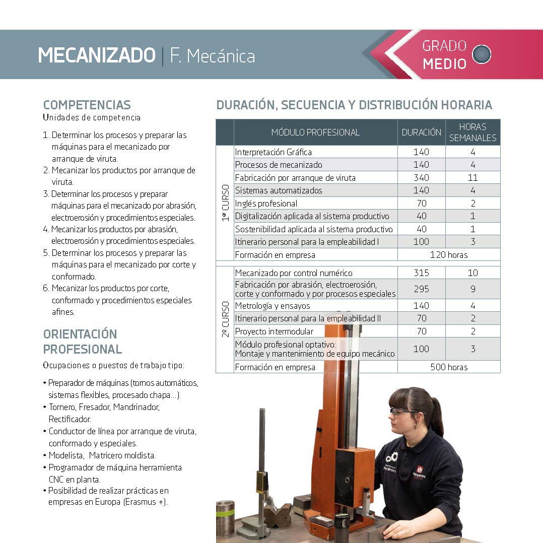 Grado medioEl objetivo del Ciclo Formativo de Grado Medio de Mecanizado en Navarra es formar a profesionales técnicos capaces de ejecutar con competencia y seguridad los procesos de mecanizado utilizados en la industria metalmecánica y de fabricación. Este ciclo capacita al alumnado para interpretar especificaciones técnicas y planos, seleccionar procesos y herramientas adecuados, preparar, programar y operar máquinas herramientas tradicionales y de control numérico (CNC), así como verificar la conformidad de los productos obtenidos según criterios de calidad, seguridad y protección ambiental.