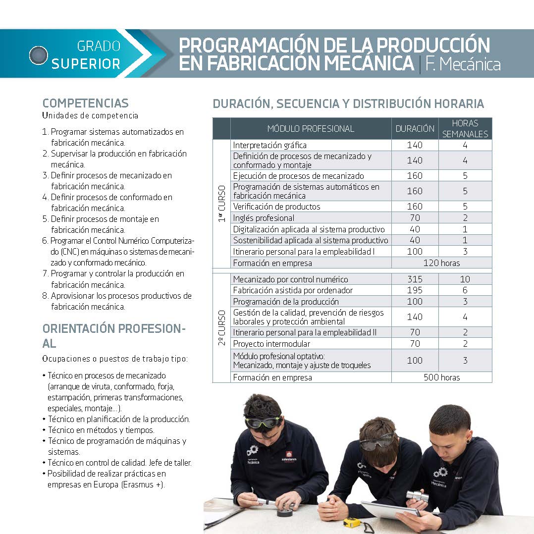 El ciclo combina contenidos técnicos relacionados con la fabricación mecánica, programación de sistemas automatizados, gestión de la producción y verificación de productos, con aspectos de prevención de riesgos laborales, protección ambiental y control de la calidad industrial. Además se trabaja con herramientas informáticas de apoyo a la planificación y programación, fortaleciendo competencias tecnológicas imprescindibles en la industria moderna.