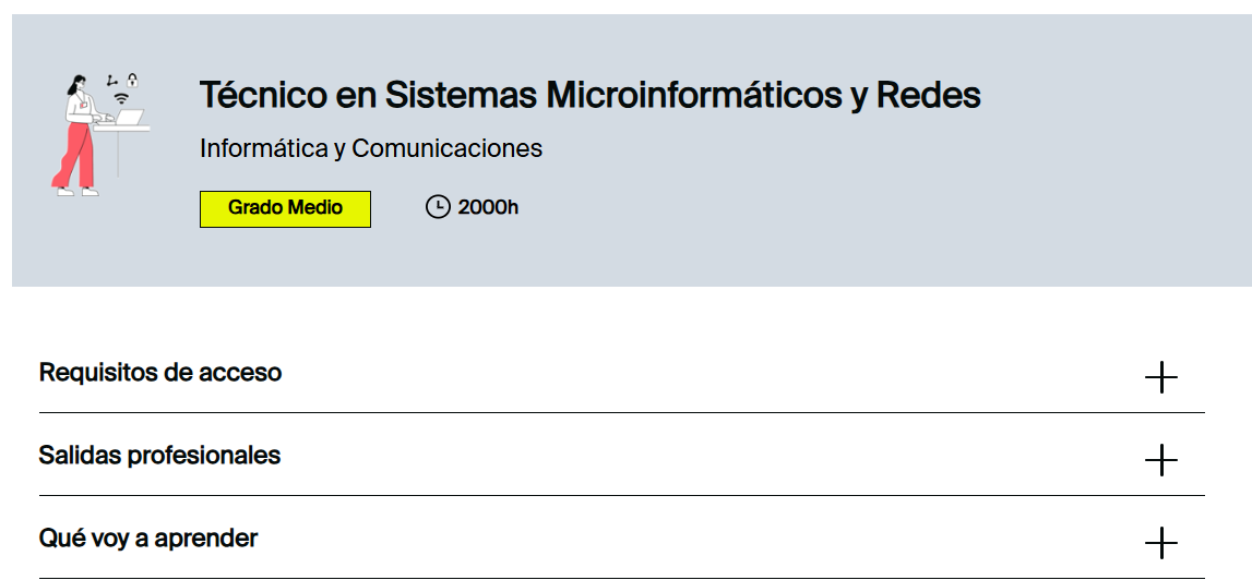 Incluye Formación en Centros de Trabajo (FCT) en empresas, facilitando la experiencia profesional real. Además, permite continuar estudios de grado superior en la familia de Informática y Comunicaciones, favoreciendo la progresión académica y profesional del alumnado.