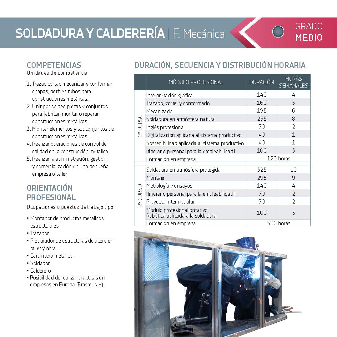 El ciclo tiene un marcado carácter práctico, centrado en el aprendizaje de técnicas de soldadura y calderería aplicadas a situaciones reales de taller. El alumnado trabaja con distintos materiales metálicos y realiza operaciones de corte, plegado, curvado, ensamblaje y soldeo, desarrollando destrezas manuales fundamentales para el sector industrial.